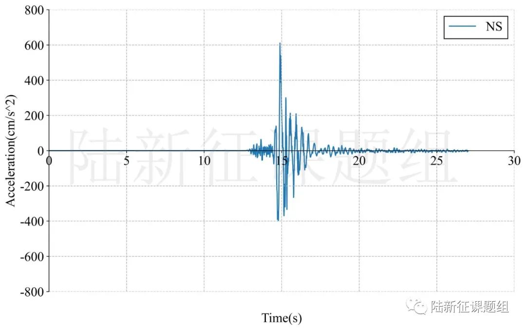 YN.ML003典型台站位置北纬25.45度,东经99.26度,记录到水平向地震动峰值加速度为684cm/s/s,竖直向地震动峰值加速度为296cm/s/s。该地震动及反应谱如图1、图2所示。