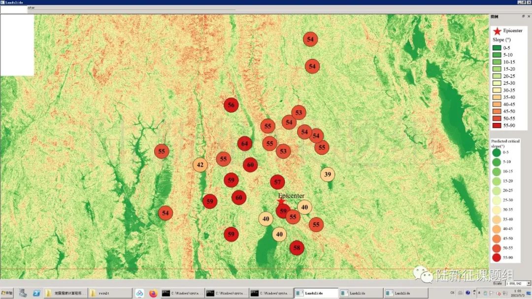 根据当地地形数据、岩性数据和实测地面运动记录,可以计算得到不同滑坡体饱和比例下的滑坡分布,如图5所示。其中,底图为当地坡度分布图,每个圆圈代表每个台站的计算结果,圆圈中的数字代表发生滑坡的临界坡度,台站附近坡度大于该数值的地方滑坡发生概率高。